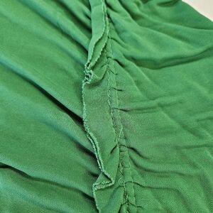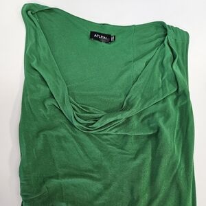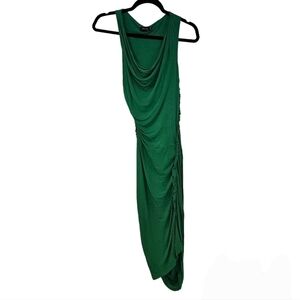 Atlein Leger green jersey dress. Pull-on style sheath bodycon mini. Sleeveless. Asymmetrical ruching and a cowl neckline. Material is 100% viscose.