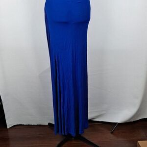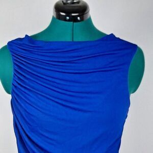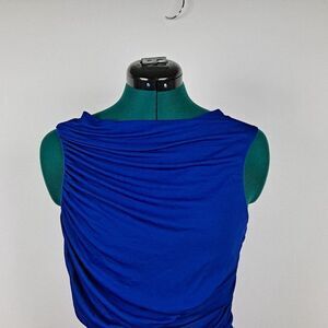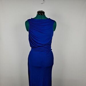 Cobalt blue, size 8. Gorgeous 100% viscose, floor length gown that will flatter. Draped neckline, sleeveless, rauched sides. Fully lined. Front panel has delicate embossing. Perfect for any formal affair!