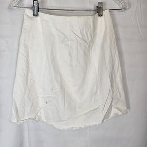 NWT ATM size 2 white button-down miniskirt with frayed hemline. There is a small dirty spot on the front and one spot on the back, both pictured. They will come out when washed or even touched up with bleach pen. This High-waisted button-down mini skirt features a button-down front and has an interior button for closure.
