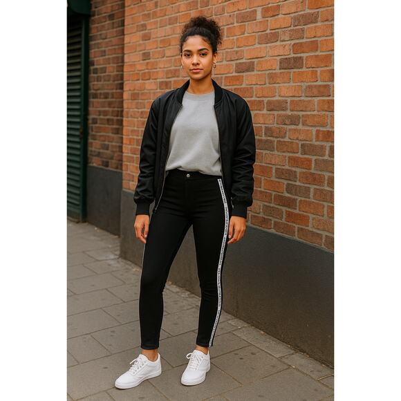 Streetwear edge meets comfort in these Atmosphere jeggings. Designed with a sleek skinny fit and bold scrolling logo down both sides, they give an instant skater-inspired vibe. Made from a sustainable cotton blend with stretch for movement, featuring a tapered ankle and zip-snap closure. Perfect for casual streetwear looks, everyday layering, or pairing with oversized tops for that skater/minimalist aesthetic. Excellent pre-owned condition, no major flaws.