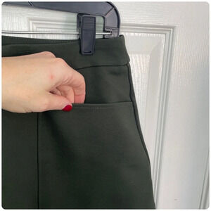 Dark Hunter Green mini skater skirt with two front pockets and hidden back zipper. This is a ponte material and very stretchy! The two front pockets are very 70’s inspired.