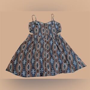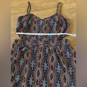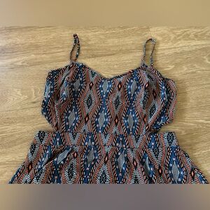 Vibrant top with intricate patterns. Features orange, blue, and black hues. Ideal for a bold look.