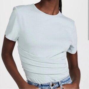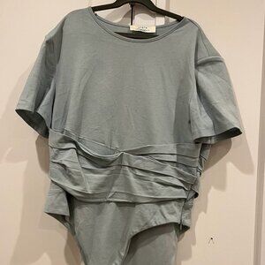 Bodysuit with t-shirt sleeve and wrap detail at waist.