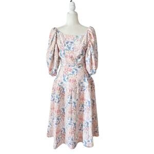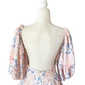 Printed midi dress featuring a puff-sleeve with elasticated sleeve hem and backless detail.