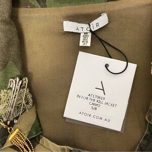 Atoir In For the Kill Jacket in a Camo Print. New with tags. Edgy jacket with distressed patches, safety pins, detachable thin gold multi-strand chains, cuffs with adjustable belts and elastic drawstring hem. Please see pictures for more details and measurements.