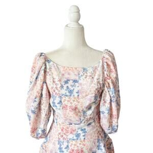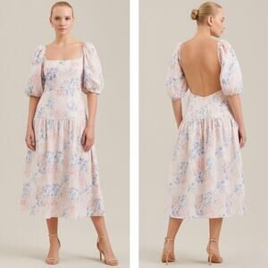 Printed midi dress featuring a puff-sleeve with elasticated sleeve hem and backless detail.