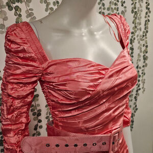 This is a new with tags Atoir "Tired of Love Dress" in the color Peach Blossom. The dress is made of 95% viscose, 4% polyester, and 1% spandex. The lining is 95% rayon and 5% spandex. The dress has a square neckline, long sleeves, and a fitted silhouette. It features a ruched design throughout and a belt. The dress is in excellent condition and has no visible imperfections.