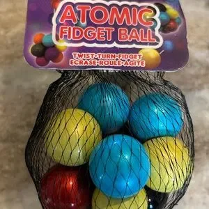 Colorful fidget balls in a mesh bag. Includes blue, yellow, and red balls. Perfect for stress relief and fun.