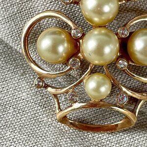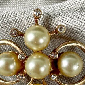 Vintage 1950s goldtone crown brooch with atomic style. Large cream faux pearls and crystals. No markings, alas.
