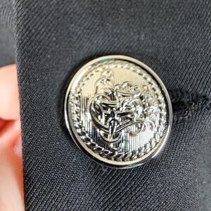 - Description: Black button front blazer with silver toned button accents; button accents at cuffs; mock neck collar; pocket at front; lined