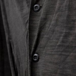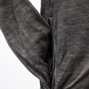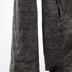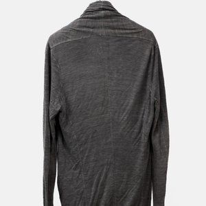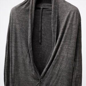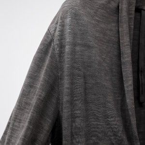 A soft long sleeve grey cardigan from Kazuyuki Kumagai Attachment featuring a deep two-button closure front, two side slip pockets, raw edge cuffs, a ruched bottom hem, and a draped stole neckline.