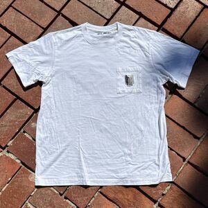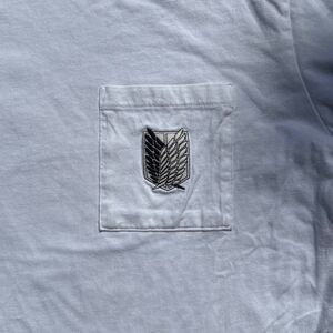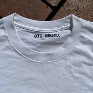The product is a men's XL white t-shirt from Uniqlo featuring an embroidered Attack on Titan design. This officially licensed UT Archive Manga shirt is a stylish addition to any fan's wardrobe, showcasing their love for the popular anime and manga series. The high-quality embroidery adds a touch of uniqueness to the classic white t-shirt, making it a standout piece for any Attack on Titan enthusiast.