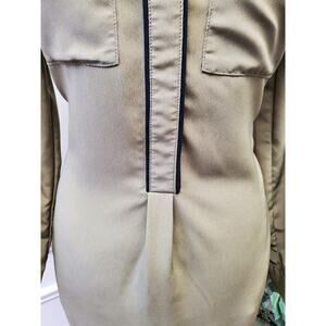 This Attention shirt dress in size small is a versatile piece with a stylish V-neckline and roll tab sleeves. The green olive color is perfect for the outdoor theme and the fit & flare/sheath style is suitable for both casual and formal occasions. The dress has a pullover closure and comes with a belt to accentuate the waist.