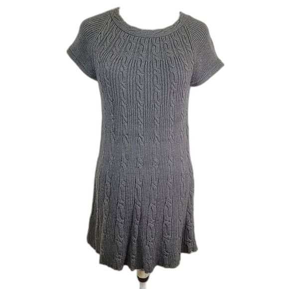 Dark gray sweater dress hardly worn. Cap sleeves. Very soft cable knit with scoop neckline. No stains, tears or damage. Please see photos for details and approximate measurements.