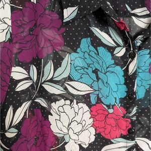 Elegant blouse with vibrant floral pattern. Features pink and blue flowers on a black polka dot background. Perfect for casual or dressy occasions. Sheer. 3/4 sleeve. 31" long , 28" flat across the bust.