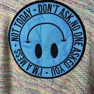 Front graphic: Blue patch with upside-down smiley and text: "NOT TODAY - DON'T ASK, NO ONE ASKED YOU - I'M A MESS"