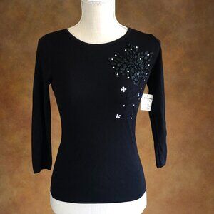 Attitude Knit Black Medium Top – Beaded Floral Sequin Detail, 3/4 Sleeve