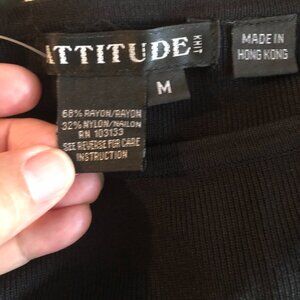 Elegant Attitude Knit top in classic black, featuring a striking floral embellishment with ribbon appliqué, beads, and sequins for a touch of sparkle. This women’s size Medium sweater-style top has a flattering fitted silhouette with 3/4 sleeves and a crew neckline. The stretch knit fabric (68% rayon, 32% nylon) offers both comfort and shape retention.