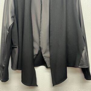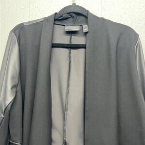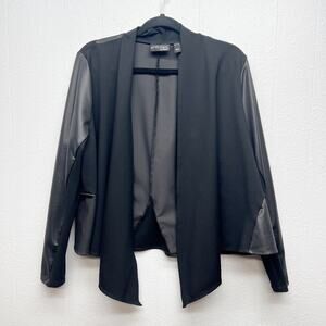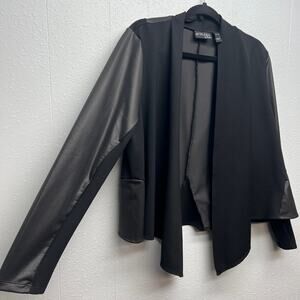 Attitudes by Renee women's black faux leather mixed media jacket. Open front. Long sleeves. Unlined. Stretch. In good used condition. No stains, tears or holes.