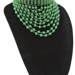 This exquisite antique necklace from the 1950s was crafted by Christian Dior, a renowned high-end jewelry designer known for his iconic creations. The necklace features a stunning cascading design composed of multiple strands of vibrant green glass beads, intricately connected by delicate gold-tone metal wires. Despite its age, this necklace is in excellent condition, showcasing the enduring quality and craftsmanship synonymous with Christian Dior's luxury pieces. The rich green hue of the glass beads adds a touch of sophistication and elegance to the overall design, making it a standout statement piece from the mid-20th century. This Christian Dior necklace is not only a testament to the designer's artistic vision but also a wearable piece of vintage fashion history that exudes timeless glamour.