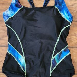 Women's XL (16-18) one piece racerback athletic swimsuit by Attraco. Black with blue and green accents. UPF 50+. Built in padded bust. Nylon/spandex/polyester blend.