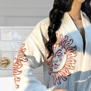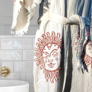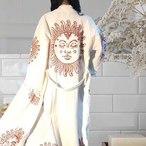 - This robe features timeless hand-printed and healing sunshine designs, which is a symbol that helps bring happiness and positivity to the wearer.