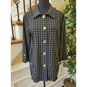 Attyre New York Women Sz L Black Plaid Jacket Golden Buttons Up Roll Tab Sleeves. Condition is "Pre-owned". Shipped with USPS Priority Mail.