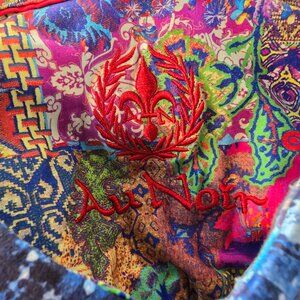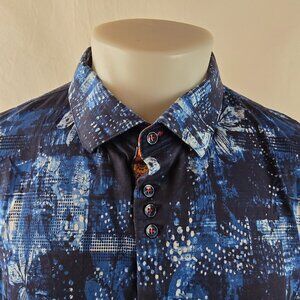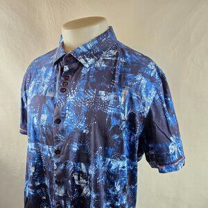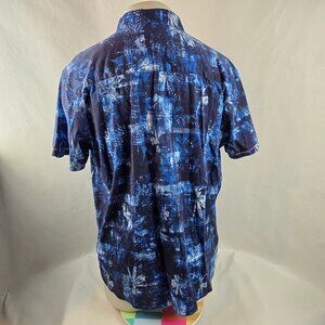 Stylish Au Noir men’s button up shirt in size 3XL. Features a bold blue abstract print with contrasting inner collar/cuffs lined in multicolor patterns. Premium quality with detailed stitching and designer look. Perfect for dressy casual wear or nights out. Excellent preowned condition.