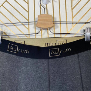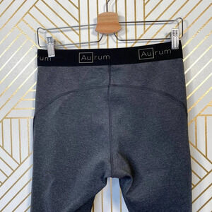 AuRum Mindfulness Mid-Rise Leggings in Gray. Full-length Mindfulness legging features a mid-rise cut and the signature Aurum exposed elastic. This piece is made from breathable, 4-way stretch fabric that is specially formulated to wick moisture away from the skin, and includes a built-in thong for optimal comfort and full coverage.