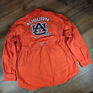 Show your team pride with this Auburn Tigers Columbia PFG fishing shirt in men’s size large. Designed in orange with vented back panels and a button-up front, it blends performance outdoor wear with NCAA fan style. Perfect for fishing, tailgates, or casual game day outfits.
