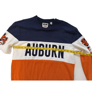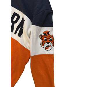 Features embroidered Auburn Tigers mascot on both sleeves, bold "AUBURN" lettering on front chest, and color block navy blue, white, and orange design