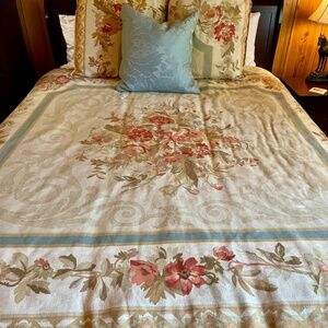 Up for your consideration is a beautiful Ralph Lauren Aubusson Fresnel Tapestry King Duvet and Two Euro Shams. Inserts not included. These are all in excellent condition, the Euro Shams have the same pattern on both the front and back. The Duvet has hidden buttons, the Euro Shams have a hidden zippered enclosure edged by beige/cream ribboning. This comes from the Aubusson Collection by Ralph Lauren and coordinates with Lambert Stripe Sheets/Pillowcases and Anne Marie Quilts/Shams in both Cream and Powder Blue.