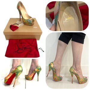 Christian Louboutin's platform python pumps are printed to create a blurred, pixelated effect. Wear this peep-toe style to complement spring's pastel shades. In Multicolor ( pink, green, blue, yellow, orange) PYTHON Pixel. Heel 5,25",platform 1.25". Comes with original box, extra heel tabs in the pouch and dust bag.