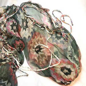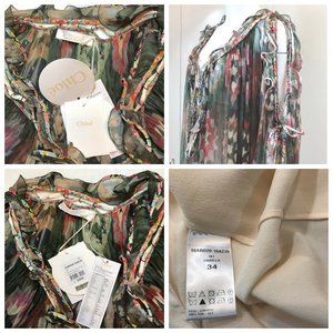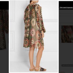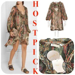 Stunning Authentic New Chloé Cutout Ruffle-Trimmed Printed Silk-hiffon -Georgette Dress Size France 34 US 0-4. Made in France . Green Multicolor. Ruffle trimmed lace up blouson sleeves. lace up ruffle trimmed front. Ruffled Lace Up Silk Flared Dress. Silk camisole with pockets Silk construction, metal rings. Length 34"