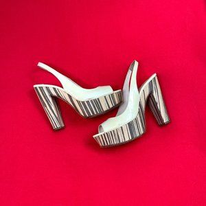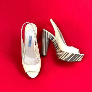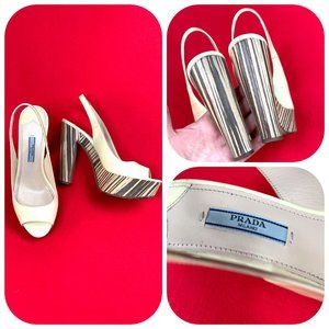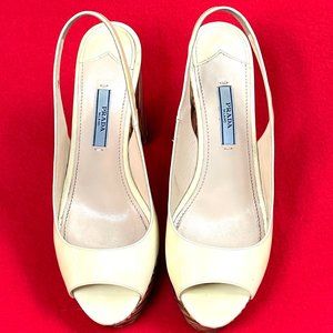 Authentic Prada 1Z647D Off White Bianco color PATENT LEATHER SLINGBACK WOOD PLATFORM SANDALS 7 ITALY 37. Striped Wood Peep Toe Platforms. Slingback strap at ankle Leather lining, Slightly padded leather insole "Prada" branding on insole, Leather outsole 1- 1/2" striped wooden platform, 4 3/4" striped wooden heel very comfy!