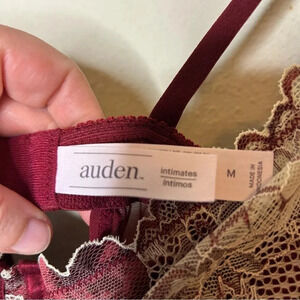 Beautiful lace detailed chemise from Auden. Color is red moving toward burgundy. Has push up padding as well as room to add additional padding, if desired. In excellent used condition. Does have underwire.