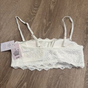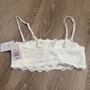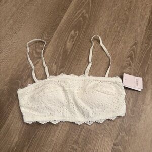 Elegant cream bandeau with eyelet pattern. Features adjustable straps. Ideal for layering.