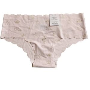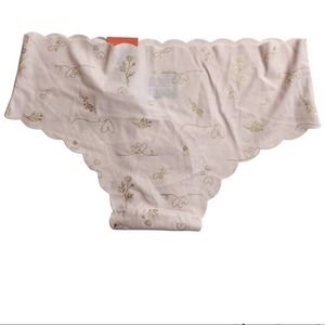 Auden Micro Hipster Invisible Edge Cheeky Panties. Low rise hipster underwear features allover floral and heart print in metallic gold with scalloped trim. Invisible edge bikini. No show, fray free. Color: Pink.