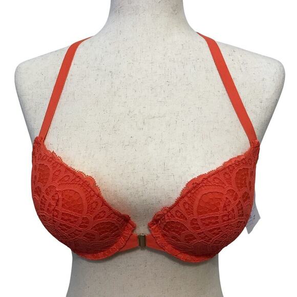 NWT. Plunge Coverage Push Up Front Close Bra for Women Size 32D. Orange, lace overlay, T-back, adjustable slides, stretchy wings, thicker padding towards bottom cups, underwire. Pictures are part of description.
