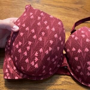 Auden The Everyday Bra Underwire. Floral Tulip Print deep red bra in women’s Size 36DD. Bra is in good used condition with no flaws or stains other than some minor wash wear. Moderately padded. Please see close-up pictures for condition details.