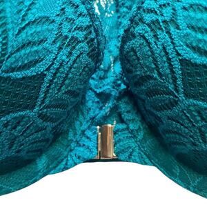 Experience comfort and style with this elegant teal lace bra. Perfect for everyday wear, racerback and front closure. Brand new with tags in size 32A.