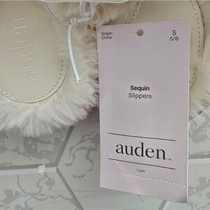 Add a touch of twinkle and warmth to your feet with these Rae Sequin Scuff Slippers from Auden. These scuff slippers are designed with a solid-color closed-toe upper embellished with sequins, and they're finished with faux-fur trim and cozy lining for all-day comfort. The slip-on style with an open back plus an indoor/outdoor outsole for all-purpose wear complete the design. Auden: Comfort true to every shape & hue. Scuff slippers Sequined upper with faux-shearling trim Faux-fur lining and insole Slip-on style with backless construction Round closed toe Indoor/outdoor outsole Sizing: Womens Care and Cleaning: Avoid Extreme Heat Footwear Lining Material: 80% Polyester and 20% Recycled Polyester Construction: Backless Footwear Insole Material: 80% Polyester and 20% Recycled Polyester Features: Slip On Toe Style: Round Toe Footwear Upper Material: 27% Plastic and 73% Polyester Footwear Outsole Material: 90% Polyester and 10% Plastic Heel: No Heel Shoe Width: Medium