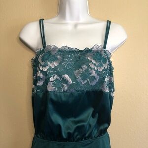 striking emerald teal hue sets the groundwork for a radiant piece, paired with floral lace across the chest and around the back for texture and dainty detail.