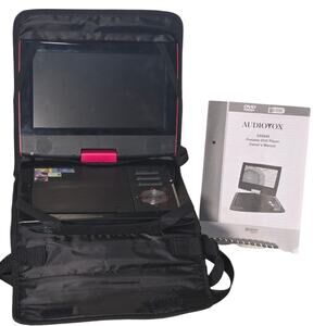 Audiovox DS9849 9″ Portable DVD Player in excellent, gently‑used condition. This unit features the swivel screen design, comes with remote control, headphones (appear unused), carrying bag, power/adaptor cable and AV cables. Playback has been tested and everything functions correctly. The screen is clear, the hinge moves smoothly, the accessories are complete and look nearly new.