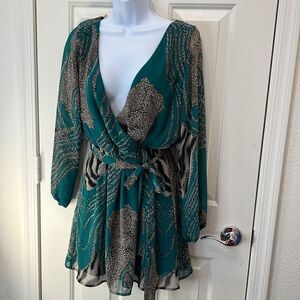 Auditions Fashion Dress V Neck Hunter Green Black Tan Animal Print Mini Belt Inc