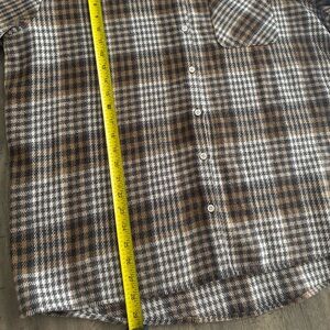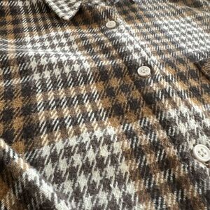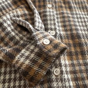 This casual button-down shirt by Audrey 3+1 features a classic plaid pattern in earthy brown and white tones. Its long sleeves and traditional collar make it a versatile choice for everyday wear.