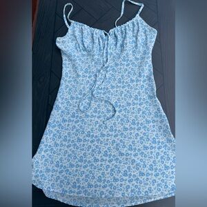 Audrey 3+1 Floral Blue Spaghetti Strap mini Dress, ruched front, no lining, S