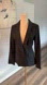 This black blazer features a single button closure, 2 front pockets, and a slightly shiny tuxedo-like lapel. Interior pinstripe lining. Its sleek design offers a timeless look that makes it a wardrobe staple. Excellent used condition.