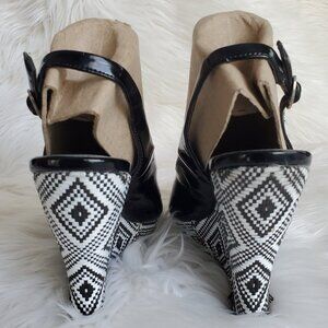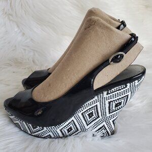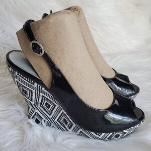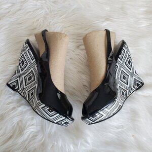 Audrey Brooke Black/White Espadrilles Peep Toe Wedge Sandals SZ 8
