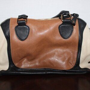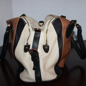 Elevate your style with this sophisticated Audrey Brooke genuine leather satchel! Featuring a chic colorblock design in tan, black, and cream, accented with luxurious gold-tone hardware, this bag offers multiple compartments to keep your essentials organized and easily accessible. Perfect for work or a stylish day out.